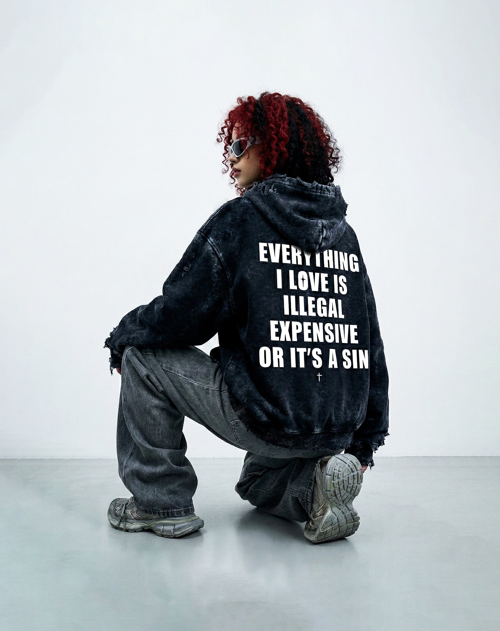 Featuring a Heavyweight 400 Gsm rugged acid wash finish and raw distressed detailing, every piece carries a unique, worn-in character. The powerful back print — “Everything I Love Is Illegal, Expensive or It’s a Sin” — makes a statement without trying too hard.