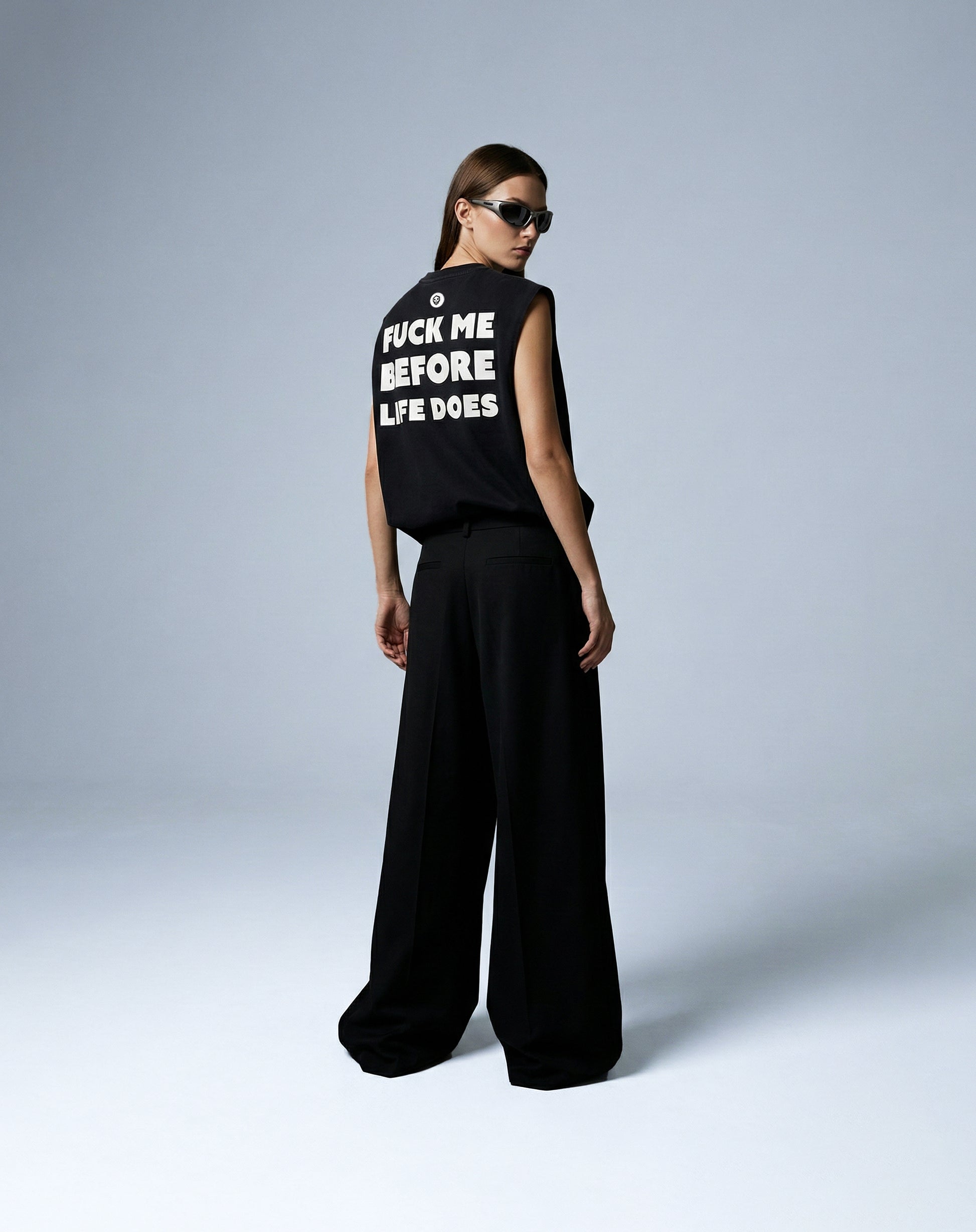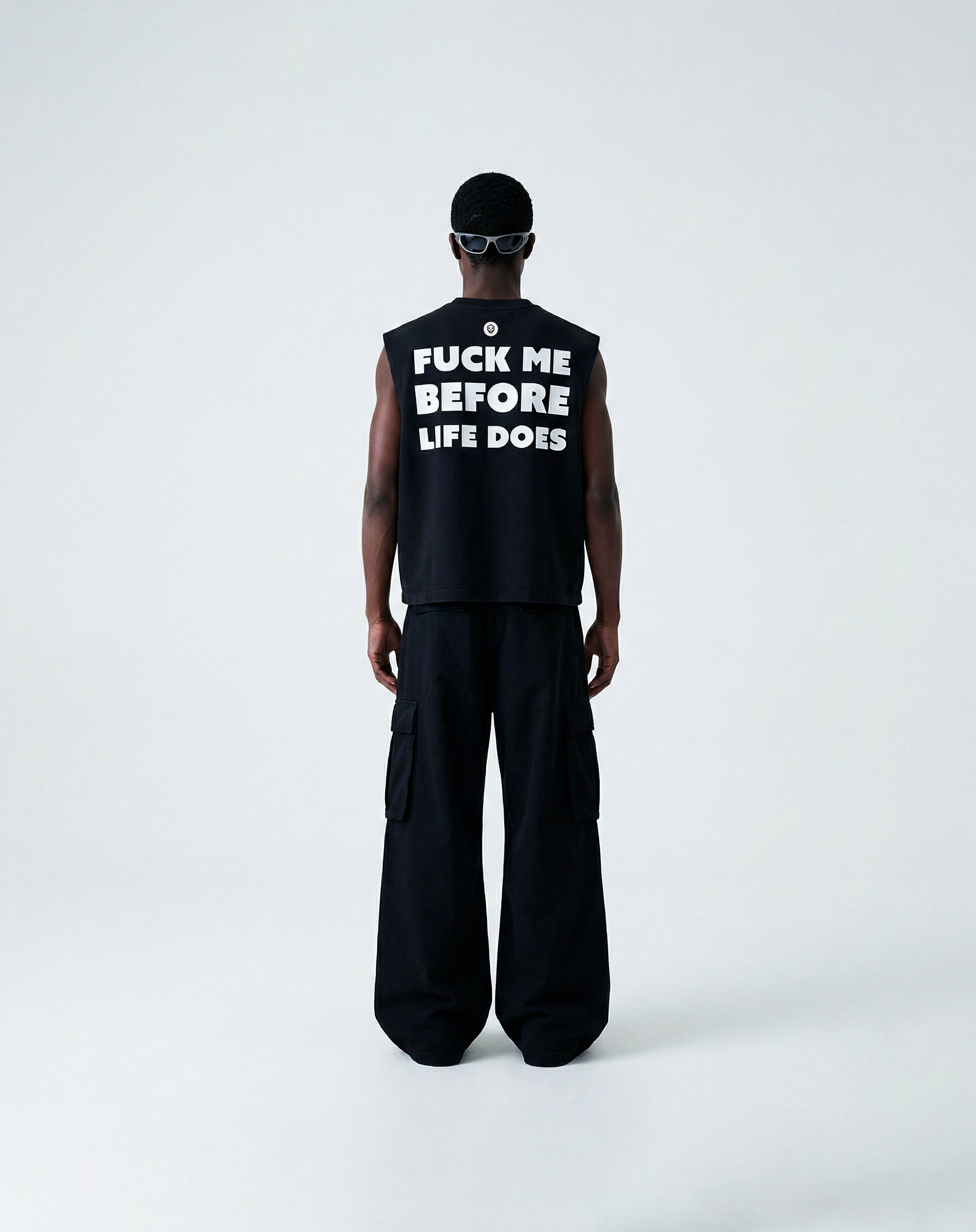 Crafted from premium cotton with a raw-edge finish, this piece carries the unapologetic message “Fuck Me Before Life Does”* in bold, high-contrast print.